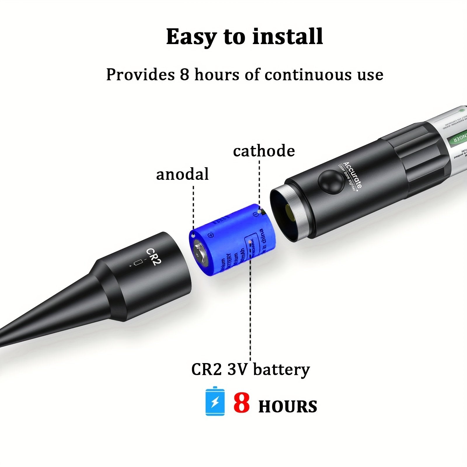 Includes 2x CR2 batteries. 8-hour continuous runtime per session â outlasts range days and hunting trips.